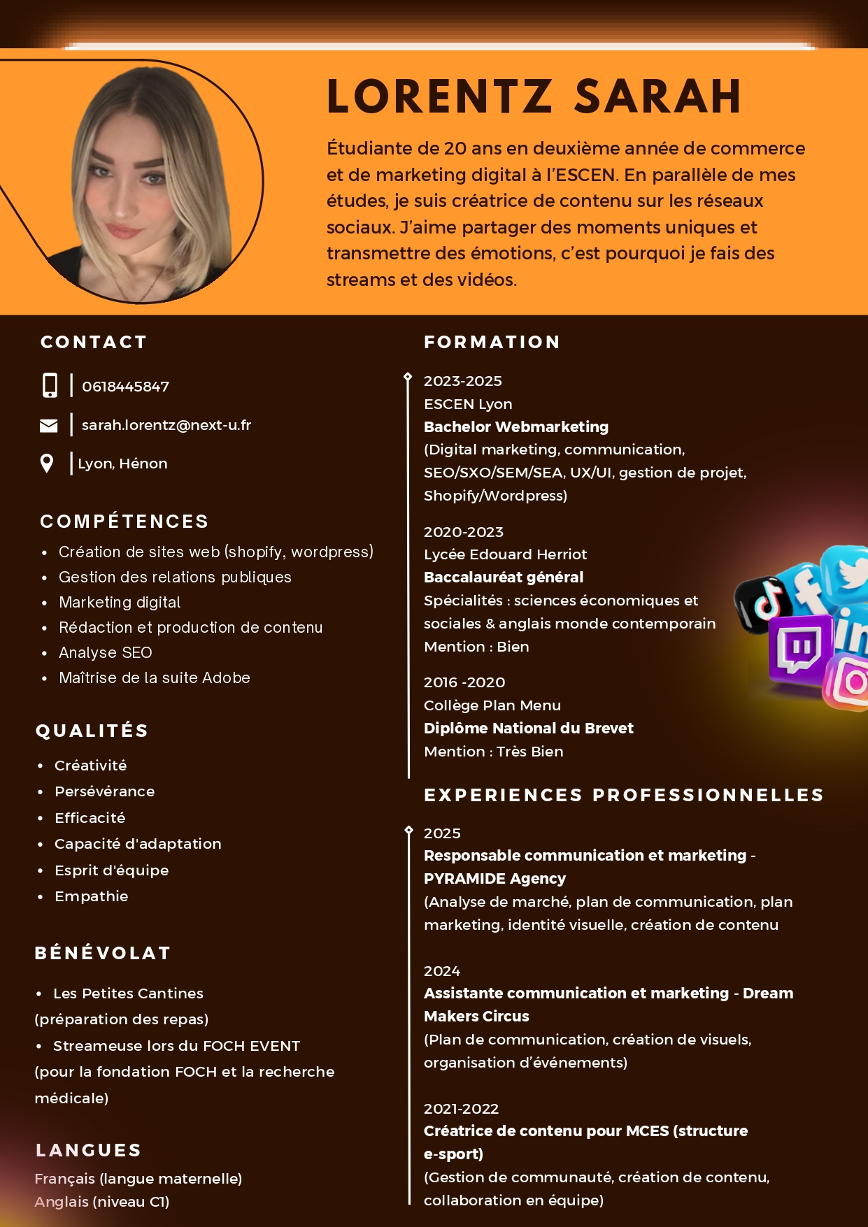 Étudiante de 20 ans en commerce et marketing digital, je développe en parallèle une activité de créatrice de contenu multigaming. Créative, dynamique et orientée résultats, je suis toujours en quête de nouveaux défis pour enrichir mes compétences, que ce soit dans l’univers digital, la stratégie de contenu ou la gestion de projet.