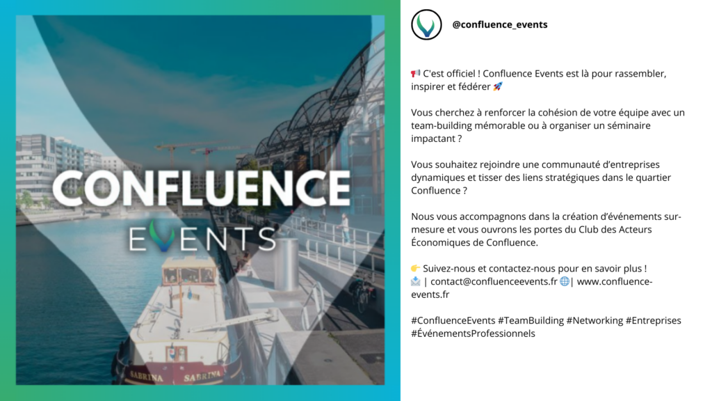 L’objectif est de positionner Confluence Events comme un interlocuteur unique, capable de centraliser l’offre événementielle du quartier et de faciliter l’organisation d’événements pour les entreprises, tout en valorisant les lieux adhérents du Club.