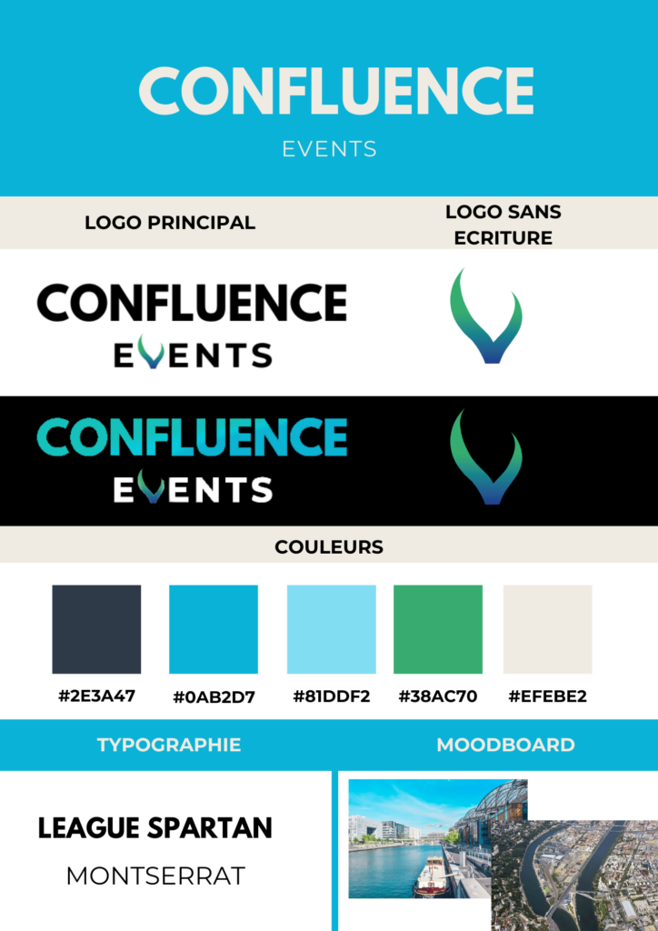 La charte graphique de Confluence Events constitue le socle du projet. Elle a été pensée pour refléter à la fois l’identité du quartier de Lyon Confluence et la vocation événementielle du projet, en s’appuyant sur des valeurs de modernité, de dynamisme, d’accessibilité et d’ancrage local.